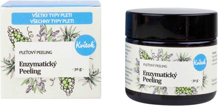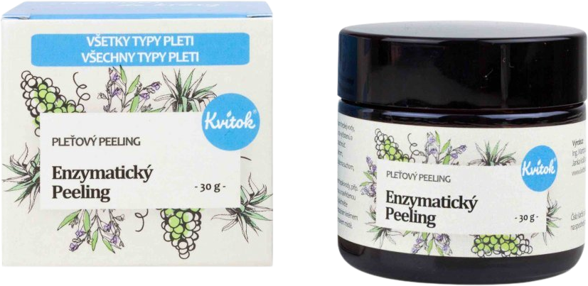Kvitok Enzymatický Peeling pre všetky typy pleti 30 mlVšetko o produkteDoplňujúce informácieHodnotenie produktu- Prírodné aktívne enzýmy - proteáza a lipáza: vhodné pre hĺbkové čistenie pokožky, účinne, ale jemne odstraňujú odumreté bunky a nečistoty a vďaka svojmu keratolytickému efektu revitalizujú, rozžiarujú pleť, bojujú proti nedokonalostiam a podporujú obnovu buniek, zároveň podporujú vyváženú tvorbu ochranného lipidového filmu, takže sú benefitom aj pre mastnú a problematickú pleť
