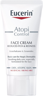 Eucerin Pleťový krém AtopiControl obsahuje 12% omega-6 mastné kyseliny pre upokojenie a výživu suchej a popraskanej pleti, a protizápalovýlicochalcon A, ktorý pôsobí proti podráždeniu. Vďaka nim hydratuje, upokojuje podráždenie, napätie a svrbenie kože. Pleť je na dotyk jemná a viditeľne hladšia. Jeho znášanlivosť atopickou pleťou bola klinicky preukázaná, a možno ho použiť už u dojčiat od 3 mesiacov veku.