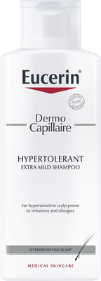 Eucerin DermoCapillaire Hypertolerantný šampón na citlivú a alergickú pokožku 250 mlVšetko o produkteDoplňujúce informácieHodnotenie produktuEucerin DermoCapillaire Hypertolerantný šampón je určený špeciálne pre osoby s veľmi citlivou vlasovou pokožkou. Jeho veľmi jemné zloženie poskytuje extra jemné umývanie vlasov a zároveň chráni vlasovú pokožku pred vysušovaním a podráždením – i v prípade, že máte hyperreaktívnu alebo alergickú pokožku hlavy. Upokojuje pokožku a zmierňuje svrbenie od prvej aplikácie.