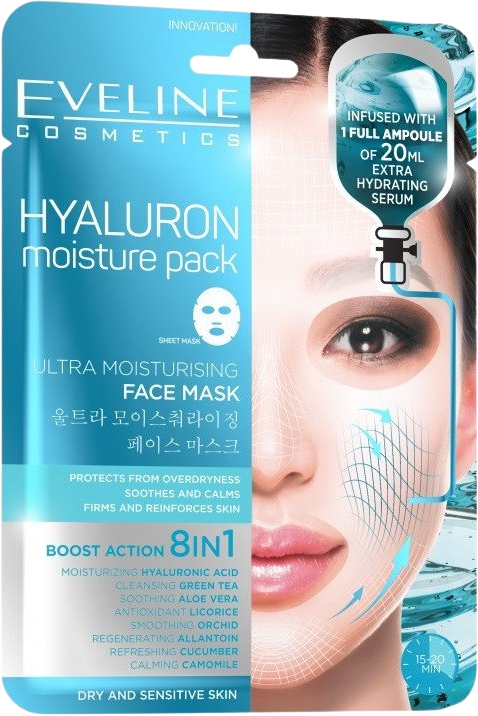 Eveline Hyalurónová hydratačná sheet látková maska Hyaluron 20 mlVšetko o produkteDoplňujúce informácieHodnotenie produktuMaska na tvár pre suchú a citlivú pleť so zvýšeným účinkom 8v1