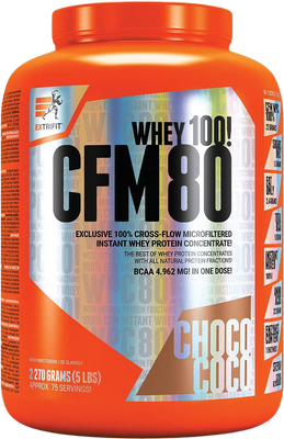 Extrifit CFM Instant Whey 80 choco coco 2.27 kgVšetko o produkteDoplňujúce informácieHodnotenie produktuOvocné príchute obsahujú aj pomleté kúsky 100 % ovocia. To všetko so siedmimi tráviacimi enzýmami, sladidlom z rastliny stévia, bez chemických farbív a so zárukou, že bielkovinová zložka je 100% najkvalitnejší instantný srvátkový proteínový koncentrát CFM z Európskej únie. Výsledný produkt je plne instantný (= ľahko rozpustný), úplne bezprašný, vysoko stráviteľný a využiteľný. Navyše v novom praktickom obale a novom balení.