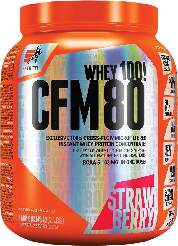 Obrovskou výhodou je zachovanie všetkých bielkovinových frakcií (pozrite si zloženie). Do proteínu CFM Instant Whey 80 sme pridali komplex siedmich enzýmov pre dokonalé trávenie bielkovín a ich zabudovanie do svalovej hmoty. Tieto enzýmy sú: papaín, alfa amyláza, bromelaín, laktáza, celuláza, neutrálna proteáza a lipáza. Ako hlavné sladidlo sme potom zvolili sladidlo z rastliny stévia 97 %! CFM Instant Whey 80 sa dodáva v 12 lahodných príchutiach. Ovocné príchute obsahujú skutočné sušené ovocie (t. j. žiadne chemikálie) a ich chuť predstavuje obrovský rozdiel! Teraz si dovolíme tvrdiť, že náš proteín CFM Instant Whey 80 chutí najlepšie zo všetkých! Chuť je plná, výrazná a nápoj je nádherne krémový. Obsah bielkovín je 72,4 – 76,2 % (líši sa podľa príchute). Okrem skvelého zloženia je tento výrobok obľúbený aj vďaka jednoduchej a bezproblémovej príprave – je dokonale rozpustný, nepráši a netvorí hrudky.