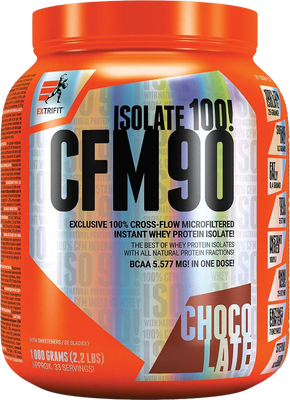 Extrifit CFM Instant Whey Isolate 90 čokoláda 1 kgVšetko o produkteDoplňujúce informácieHodnotenie produktuJedná sa o inštantný (ľahko rozpustný) 90% proteínový izolát získaný zo srvátky najmodernejšou a najšetrnejšou výrobnou metódou - mikrofiltráciou CFM (Cross-Flow Microfiltration) so zachovaním všetkých cenných bielkovinových frakcií (pozri zložky) a s veľmi vysokým obsahom BCAA a glutamínu. Tento spôsob výroby sa vykonáva za studena na keramických filtroch a je najšetrnejším spôsobom výroby srvátkovej bielkoviny. Pridáva sa však aj komplex siedmich enzýmov (papaín, alfa amyláza, bromelaín, laktáza, celuláza, neutrálna proteáza, lipáza) a sladidlo z rastliny stévia.