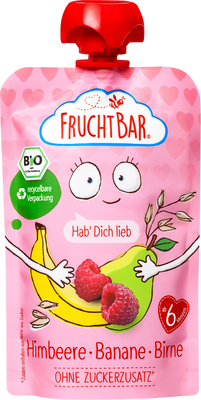 Organická ovocná vrecka s banánom, hruškou, malinami a ovsenými vločkami je vhodná pre deti od ukončeného 6. mesiaca. Bez chemických látok a pridaného cukru. Obal je plne recyklovateľný a výrobok pochádza z certifikovaného ekologického poľnohospodárstva. Viac informácií