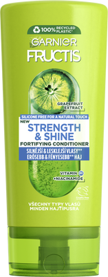 Garnier Fructis Strength & Shine Posilňujúci balzam pre všetky typy vlasov bez lesku a sily, 200 mlVšetko o produkteDoplňujúce informácieHodnotenie produktuBalzam pre všetky typy vlasov obohatený o vitamín B6 posilňuje vlasové vlákno a vlasom dodáva zdravší vzhľad + niacínamid ich zbavuje nadbytočnej mastnoty. Zloženie obohatené o výťažok z grapefruitu zanecháva vlasy silnejšie a až 3x lesklejšie (1).