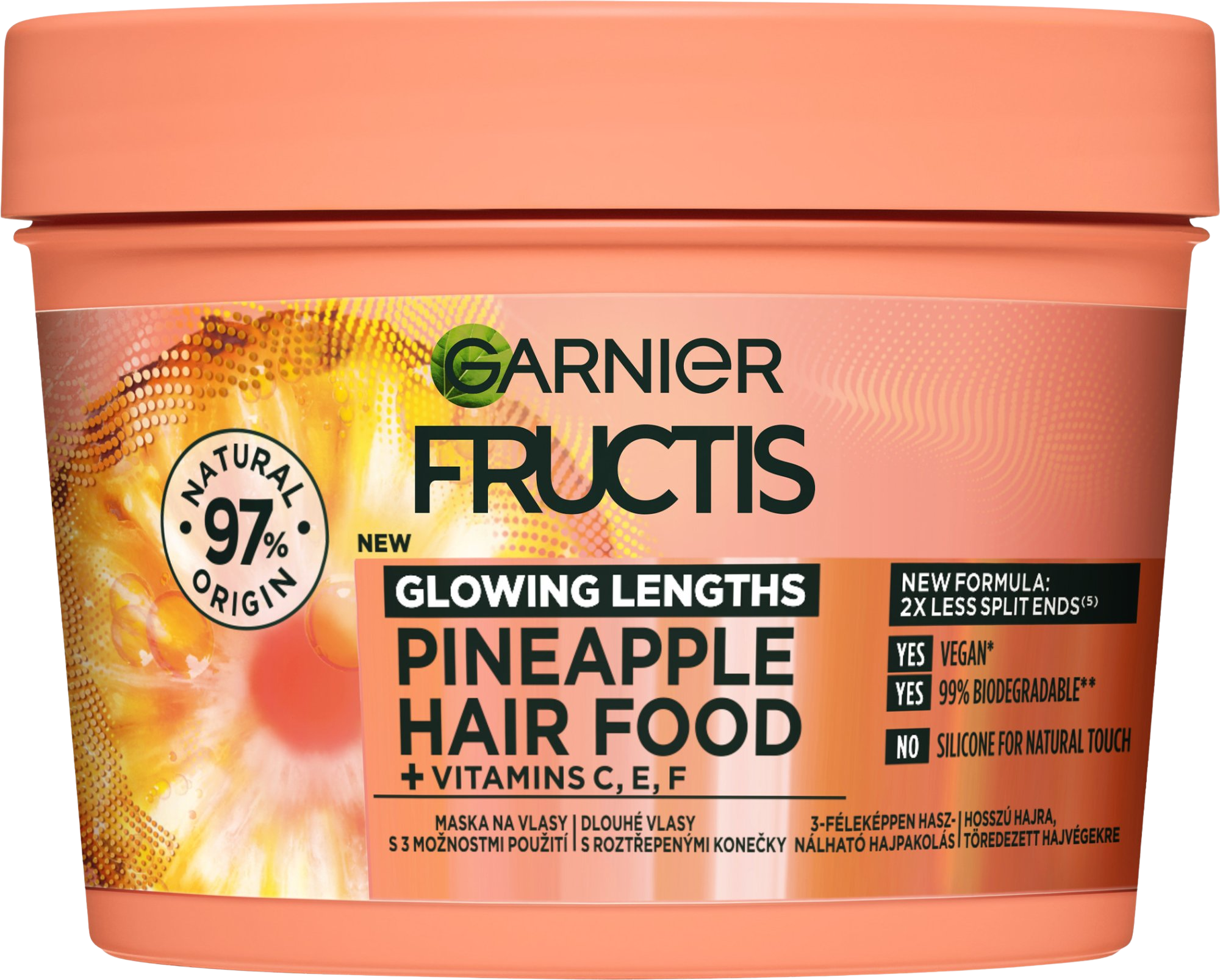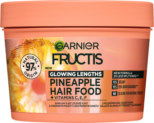 Garnier Fructis Hair Food Pineapple maska na vlasy, 400 mlVšetko o produkteDoplňujúce informácieHodnotenie produktuMaska na dlhé a mdlé vlasy s rozštiepenými končekmi, obohatená o vitamíny C, E a F s 3 možnosťami použitia.