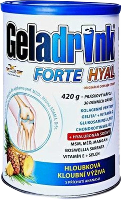 Geladrink Forte Hyal práškový nápoj ananás 420 gVšetko o produkteDoplňujúce informácieHodnotenie produktuJe zdrojom látok s výživovým a fyziologickým účinkom, ktoré dopĺňajú bežnú stravu a môžu sa používať na komplexnú výživu kostí a chrupaviek kĺbov. GELADRINK FORTE HYAL je určený pre zdravých ľudí, ktorí preťažujú alebo zaťažujú kĺby fyzickou prácou, športom, nadmerným alebo nedostatočným pohybom, sedavým zamestnaním, nadváhou alebo nosením ťažkých bremien a pre starších ľudí.