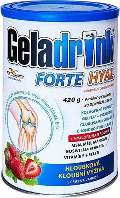 Geladrink FORTE HYAL je výživový doplnok vo forme prášku, ktorý obsahuje kolagénové bielkoviny, kolagénové peptidy Gelita 3000Da, glukozamín sulfát, chondroitín sulfát, hyaluronát sodný, MSM, Boswellia Serrata, vitamín C, vitamín E, selén, mangán a meď. Viac informácií