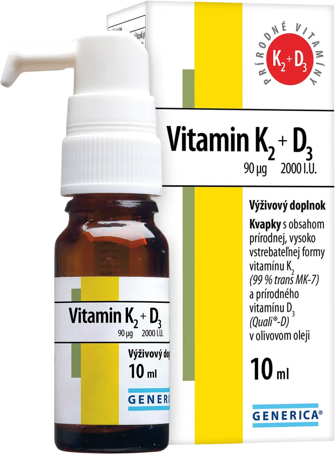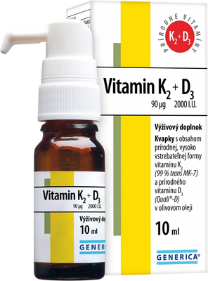 Generica Vitamin K2 90 µg + D3 2000 I.U. 10 mlVšetko o produkteDoplňujúce informácieHodnotenie produktuPraktická forma kvapiek; až 190 kvapiek v 1 balení.