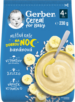 Cereálno-mliečna kaša Banánová na dobrú noc je kombináciou kvalitnej ryžovej múky, jemnej banánovej príchute a vitamínov, ktoré uspokoja potreby dieťaťa a jeho chuť na sladké. Je bezlepková, takže je dobrým štartom pre každé malé bruško v čase prvých príkrmov. Kaša je vhodná pre deti od ukončeného 4. mesiaca. Viac informácií