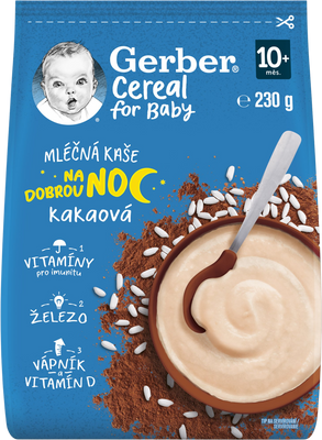 GERBER Cereálna mliečna kaša Kakao na dobrú noc je kombináciou kvalitnej ryžovej múky, jemnej kakaovej príchute a vitamínov, ktoré uspokoja potreby dieťaťa a jeho chuť na sladké. Kaša je vhodná pre deti od ukončeného 10. mesiaca. Viac informácií