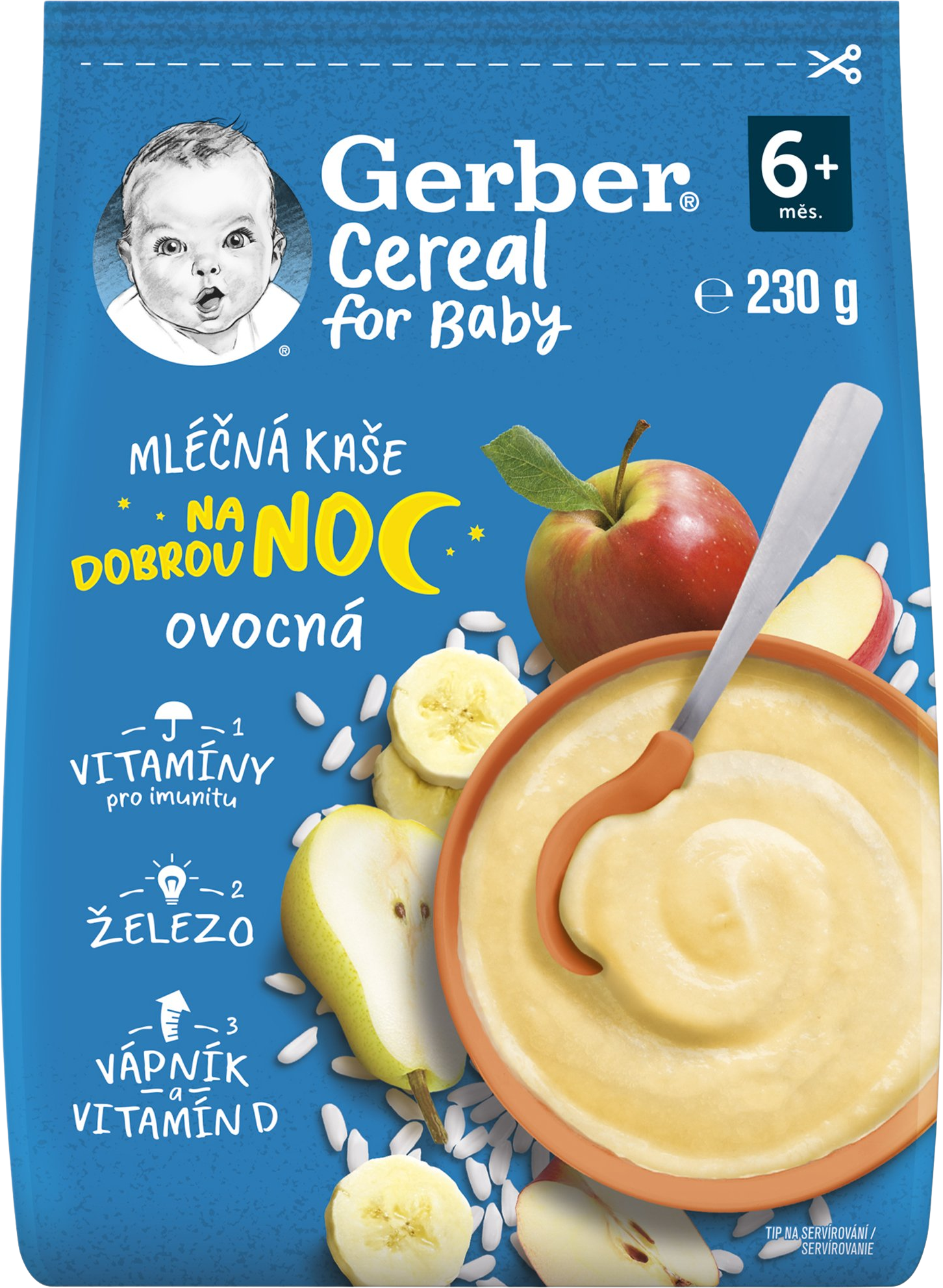 GERBER Cereálno-mliečna kaša Ovocná na dobrú noc je kombináciou kvalitnej ryžovej múky, jemnej chuti jabĺk, hrušiek a banánov a vitamínov, ktoré uspokoja potreby dieťaťa a jeho chuť na sladké. Kaša je vhodná pre deti od ukončeného 6. mesiaca. Viac informácií