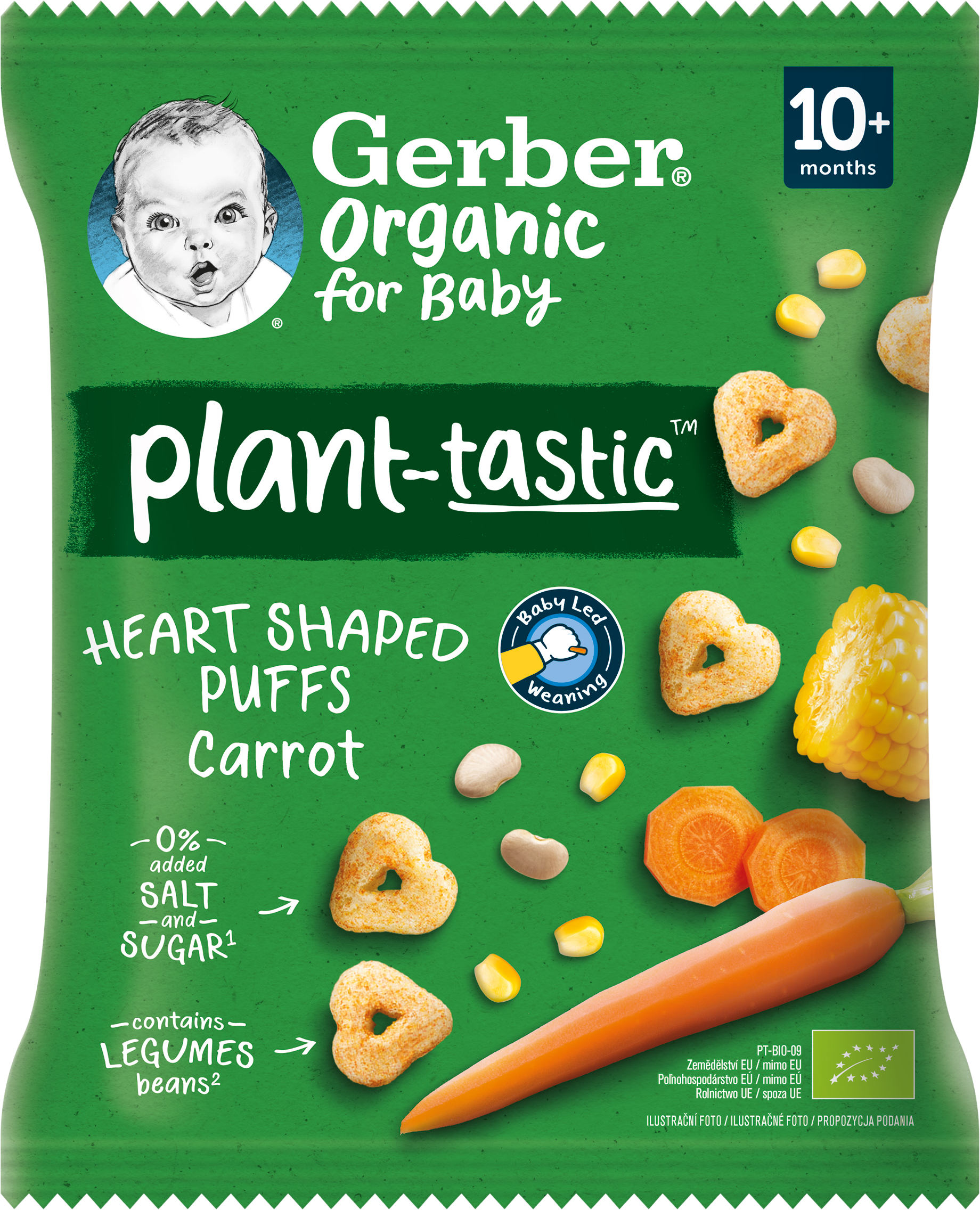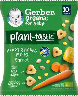 Gerber Organic chrumkavé srdiečka s mrkvou 28 g. Organické kukuričné a fazuľové chrumky s mrkvou. Extrudovaný výrobok. Od konca 10. mesiaca. Viac informácií