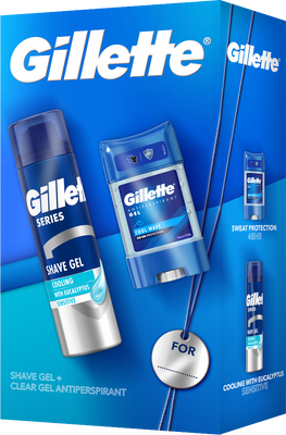 Gillette Darčeková sada pre osobnú starostlivosťVšetko o produkteDoplňujúce informácieHodnotenie produktuDarujte praktický darček, ktorý poteší každého muža. Darčeková súprava Gillette obsahuje dva produkty: priehľadný gélový antiperspirant Cool Wave, ktorý chráni pred poctou a zápachom až 48 hodín. Má sviežu, príjemnú a mužnú vôňu a navyše oceníte jeho chladivý účinok počas horúcich dní. Druhým výrobkom je chladivý gél na holenie Series Cooling s eukalyptom, ktorý prináša osvieženie, upokojenie a ochranu citlivej pokožky. Umožňuje rýchle a hladké oholenie.
