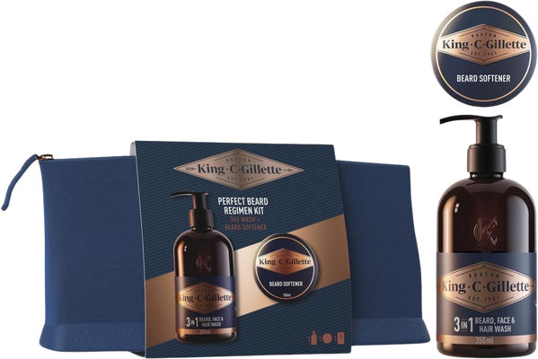 Gillette King C. darčeková taška 3v1 umývací prostriedok na fúzy, tvár a vlasy 350 ml + balzam na fúzy 100 mlVšetko o produkteDoplňujúce informácieHodnotenie produktuDarčeková súprava Perfect Beard Regimen Kit je ideálnou voľbou pre mužov, ktorí by chceli komplexnú starostlivosť o svoje fúzy. Obsahuje umývací prípravok na bradu, tvár a vlasy Gillette 3v1 a zmäkčovač na bradu King C.