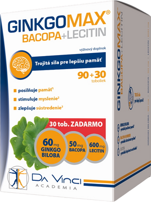 Da Vinci Academia Ginkgomax + Bacopa + Lecitín, 120 tobolekVšetko o produkteDoplňujúce informácieHodnotenie produktuVýživový doplnok, ktorý je unikátny svojím inovovaným a posilneným zložením s obsahom štandardizovaného extraktu z Ginkgo biloby, vysokým obsahom Lecitínu a novopridanej látky Bacopa monnieri. Synergické pôsobenie týchto látok a najmodernejšie technológie výroby zvyšujú účinnosť prípravku.
