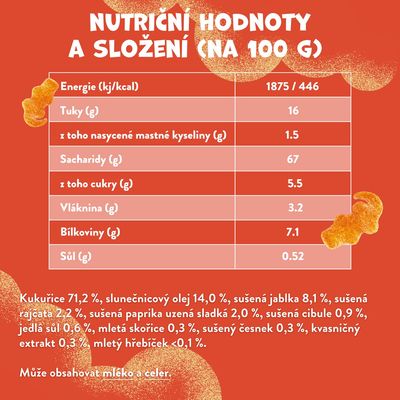 Kukurica 71,2 %, slnečnicový olej 14,0 %, sušené jablká 8,1 %, sušené paradajky 2,2 %, sušená údená paprika 2,0 %, sušená cibuľa 0,9 %, soľ 0,6 %, mletá škorica 0,3 %, sušený cesnak 0,3 %, kvasnicový extrakt 0,3 %, mletý klinček 0,1 %. Môže obsahovať MILKO a CELER.
