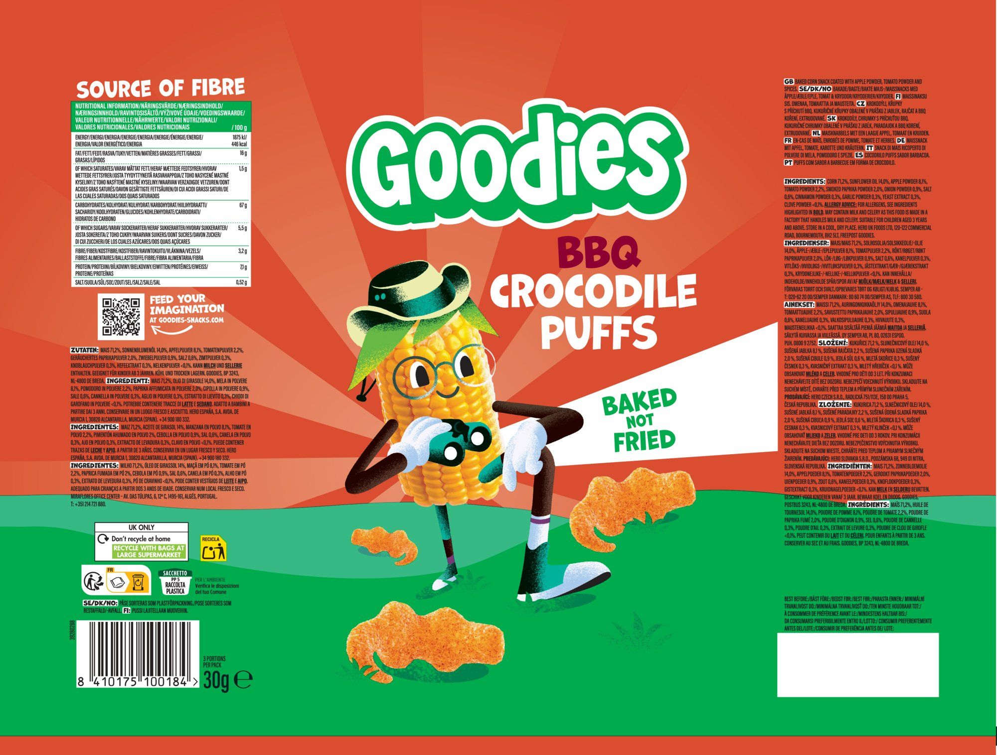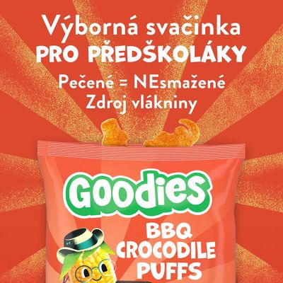 Goodies BBQ Crocodile Crisps – chrumkavá pochúťka s príchuťou BBQ, ktorá deti zabaví. Pre deti od 3 rokov. Viac informácií