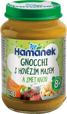 - Dojčenský príkrm Hamánek Gnocchi s hovädzím mäsom a smotanou je určený pre deti od ukončeného 8. mesiaca