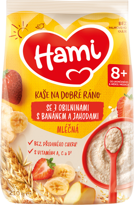 Hami kaša Na dobré ráno je vyrobená zo starostlivo kontrolovaných obilnín, ktoré sú prirodzeným zdrojom energie. Obsahuje tiež potrebné vitamíny a minerálne látky. Okrem iného obsahuje legislatívou predpísaný vitamín D a vápnik, ktoré sú potrebné pre normálny rast a vývoj kostí u detí. Viac informácií