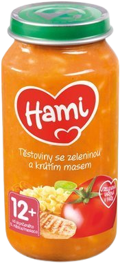 Hami cestoviny so zeleninou a morčacím mäsom pre deti od 12 mesiacov. Táto desiata neobsahuje pridanú soľ ani mliečne zložky a je bez konzervačných látok. Viac informácií