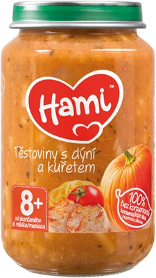 Hami Príkrm Cestoviny s tekvicou a kuraťom 200 gVšetko o produkteDoplňujúce informácieHodnotenie produktuVšetky receptúry príkrmov sú zostavené tak, aby vynikla prírodná chuť zeleniny a mäsa, a to úplne bez dochucovadiel. Dôležité je zabezpečiť dieťaťu dostatočný príjem všetkých živín, a preto je vhodné jednotlivé druhy zeleniny a mäsa striedať. Hami vo svojich príkrmoch ponúka 21 druhov zeleniny a 9 druhov mäsa.