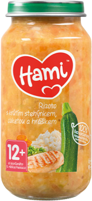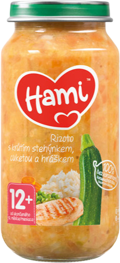 Hami Príkrm Rizoto s morčacím stehienkom cuketou a hráškom 250 gVšetko o produkteDoplňujúce informácieHodnotenie produktuPríkrm je vyrobený zo surovín vysokej kvality, má nízky obsah sodíka (neobsahuje pridanú soľ, ktorá zaťažuje obličky dieťaťa) a je 100% bez konzervantov, tak ako všetka dojčenská a detská výživa podľa zákona.
