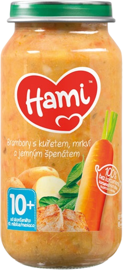 Hami Príkrm Zemiaky s kuraťom mrkvou a jemným špenátom 250 gVšetko o produkteDoplňujúce informácieHodnotenie produktuBatoľací vek so sebou prináša zmenu v chutiach dieťaťa. Batoľaťa sú často preberavé a znižuje sa im chuť do jedla. Je to celkom normálne a nie je potrebné mať obavy. Batoľa toho stále zje ešte výrazne menej ako dospelý – jeho porcia jedla predstavuje približne 1/4 veľkosti porcie pre dospelých.