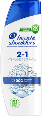 Head & Shoulders Classic Clean 2in1, Šampón proti lupinám 330 mlVšetko o produkteDoplňujúce informácieHodnotenie produktuŠampón proti lupinám Head & Shoulders 2v1 Classic Clean pre všetky typy vlasov a všetky typy pokožky hlavy. Pôsobí aj proti odolným lupinám. Šampón na každodenné použitie pre mužov a ženy so zložením Microbiome Balance, ktoré sa zameriava na hlavnú príčinu lupín a udržiava vyvážený mikrobióm pokožky hlavy. Pôsobí proti viditeľným aj neviditeľným lupinám tým, že uvoľňuje 2× viac ochranných zložiek, ktoré sa dostanú do pórov a zabránia návratu tvrdohlavých lupín. Tento šampón 2 v 1 obsahuje o 25 % viac ošetrujúcich zložiek ako bežný šampón Head & Shoulders, je klinicky overený, dermatologicky testovaný a má vyvážené pH.