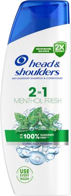 Head & Shoulders Mentol Fresh 2v1, Šampón s kondicionérom proti lupinám 330 mlVšetko o produkteDoplňujúce informácieHodnotenie produktuŠampón proti lupinám Head & Shoulders 2v1 Menthol pre všetky typy vlasov a všetky typy pokožky hlavy. Pôsobí aj proti odolným lupinám. Šampón na každodenné použitie pre mužov a ženy s Microbiome Balance, ktorý sa zameriava na hlavnú príčinu lupín a udržiava vyvážený mikrobióm pokožky hlavy. Pôsobí proti viditeľným aj neviditeľným lupinám tým, že uvoľňuje 2× viac ochranných zložiek, ktoré sa dostanú do pórov a zabránia návratu tvrdohlavých lupín. Tento šampón 2 v 1 obsahuje o 25 % viac ošetrujúcich zložiek ako bežný šampón Head & Shoulders, je klinicky overený, dermatologicky testovaný a má vyvážené pH.