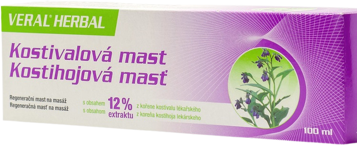 Herbacos VERAL HERBAL Kostihojová masť 100 mlVšetko o produkteDoplňujúce informácieHodnotenie produktuObsahuje výťažok z koreňa kostihoja lekárskeho. Hlavnou účinnou zložkou kostihoja je alantoín, ktorý podporuje regeneráciu kostí, chrupaviek, ďalej urýchľuje bunkovú regeneráciu a odstraňuje svalovú únavu. Masť sa používa po úrazoch (napr. zlomeniny, vykĺbení, pomliaždeniny), k masážam svalov, kĺbov a šliach a ďalej pri natiahnutí, únave a bolestiach.