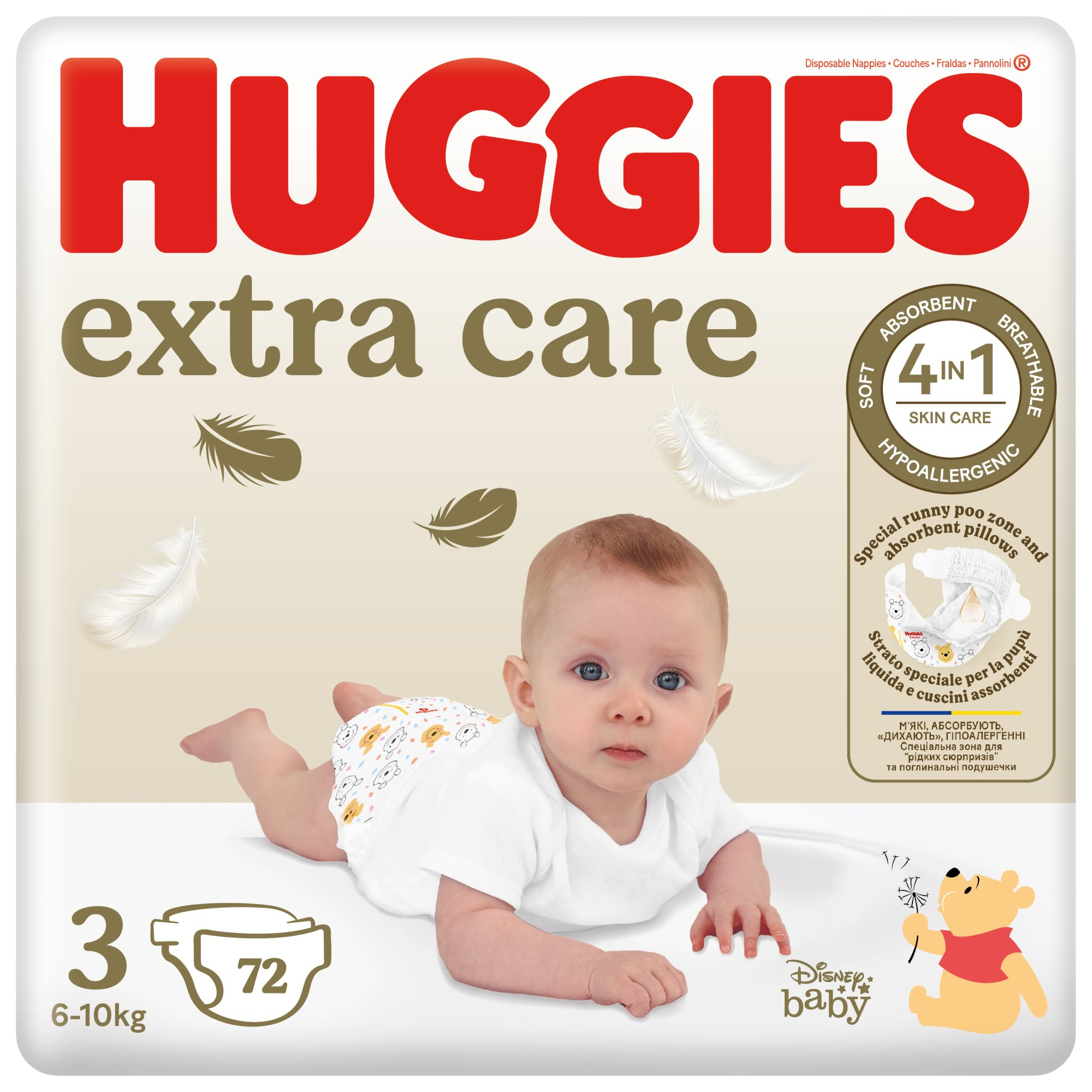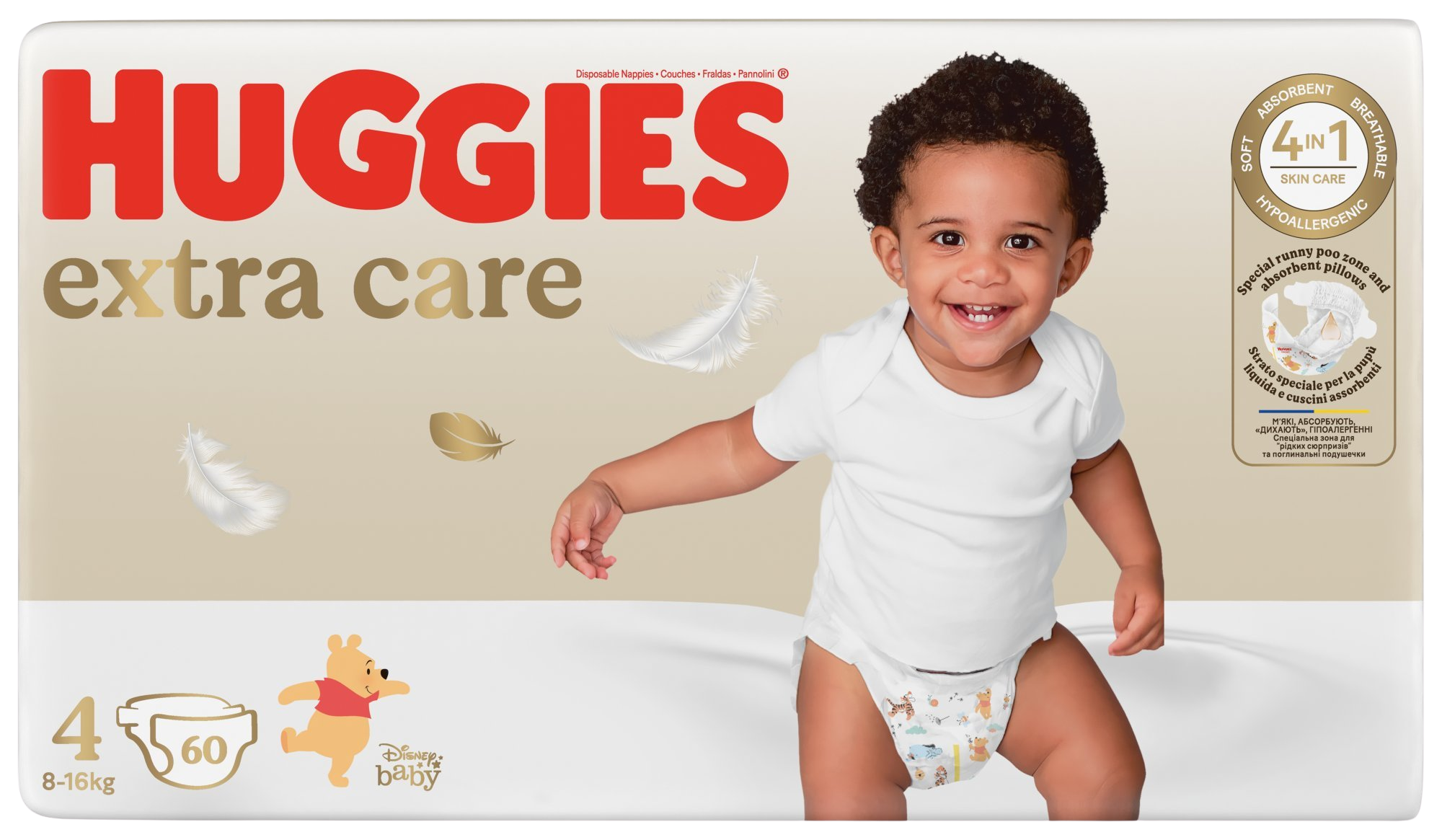 Nové prémiové jednorazové plienky HUGGIES® EXTRA CARE sú najmäkšie a najjemnejšie plienky značky HUGGIES®. Dve špeciálne absorpčné zóny pre ešte lepšiu ochranu pokožky – mäkké vankúšiky v prednej časti a vrecko na tekutú stolicu v zadnej časti. Poskytuje starostlivosť o pokožku 4v1 – mäkké, absorpčné, priedušné a hypoalergénne. Indikátor vlhkosti mení farbu, keď je čas na výmenu plienky. Mäkký elastický pás pomáha predchádzať zapareninám na citlivej detskej pokožke. Plienky od narodenia do 25 kg.