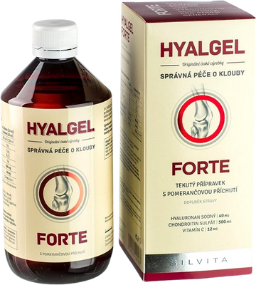 Silvita HYALGEL FORTE sirup s príchuťou pomaranča 500 mlVšetko o produkteDoplňujúce informácieHodnotenie produktuVýživový doplnok Hyalgel Forte obsahuje hyaluronan sodný, chondroitín sulfát a vitamín C (kyselina askorbová 80mg/100 ml), ktorý prispieva k normálnej tvorbe kolagénu pre normálnu funkciu chrupaviek. Výrobok je vhodný predovšetkým pri väčších ťažkostiach pre staršiu generáciu, osoby s vyšším zaťažením kĺbov ako sú športovci, osoby s nadváhou, ťažko pracujúci a osoby po úrazoch.