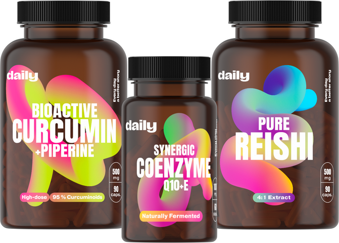 Daily dlhý život a vitalita spája tri prémiové doplnky – koncentrovaný extrakt z kurkumy s piperínom na podporu rovnováhy a zdravého starnutia, synergickú kombináciu koenzýmu Q10 s vitamínom E pre vnútornú bunkovú energiu a ochranu pred oxidačným stresom a hubu Reishi, tradične spájanú s vitalit. Všetko vyrobené v Česku, bez zbytočných prísad.