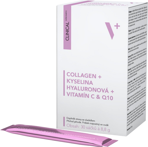 Doplnková výživa s 5000 mg hydrolyzovaného hovädzieho kolagénu typu I a III, kyselinou hyalurónovou, biotínom, vitamínom C a Q10 prináša starostlivosť o pokožku, vlasy a nechty.