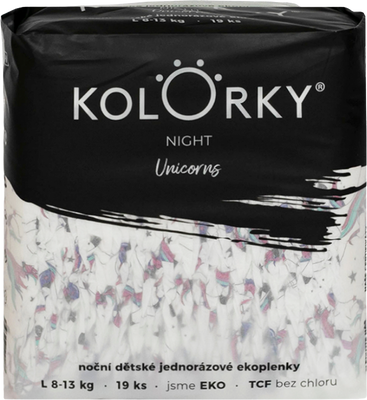 Kolorky NIGHT Jednorožec veľ. L (8-13 kg) 19 ksVšetko o produkteDoplňujúce informácieHodnotenie produktuKOLORKY NIGHT myslia na pokojnú noc vášho bábätka, jeho zdravie, ale aj prírodu okolo seba a krásny dizajn. Vďaka zvýšenej absorpčnej vrstve máte istotu, že bábätko zostane v suchu celú noc. Indikátor vlhkosti vám ukáže, či je potrebné plienku vymeniť.