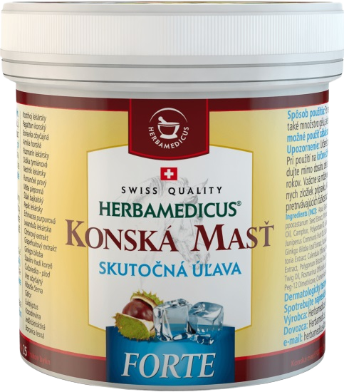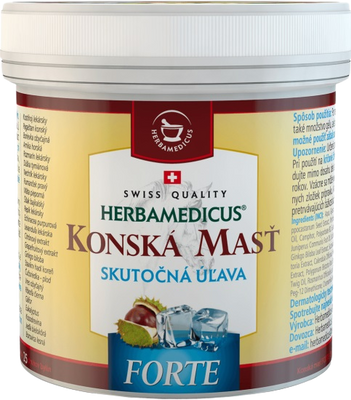 Herbamedicus Konská masť chladivá FORTE 250 mlVšetko o produkteDoplňujúce informácieHodnotenie produktuKONSKÁ MASŤ OBSAHUJE 25 BYLINNÝCH EXTRAKTOV, O KTORÝCH JE ZNÁME, ŽE: