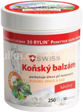 Konský balzam SWISS hrejivý je unikátny krém poskytujúci rýchlu a dlhodobú úľavu stuhnutým kĺbom, unaveným svalom a natiahnutému chrbtu. Originálna receptúra obsahuje extrakty z30 bylín a účinných látok. Výnimočné je využitie tradičných liečivých rastlín BOSWÉLLIE, OSTROPESTRECA a CHMEĽU. Viac informácií
