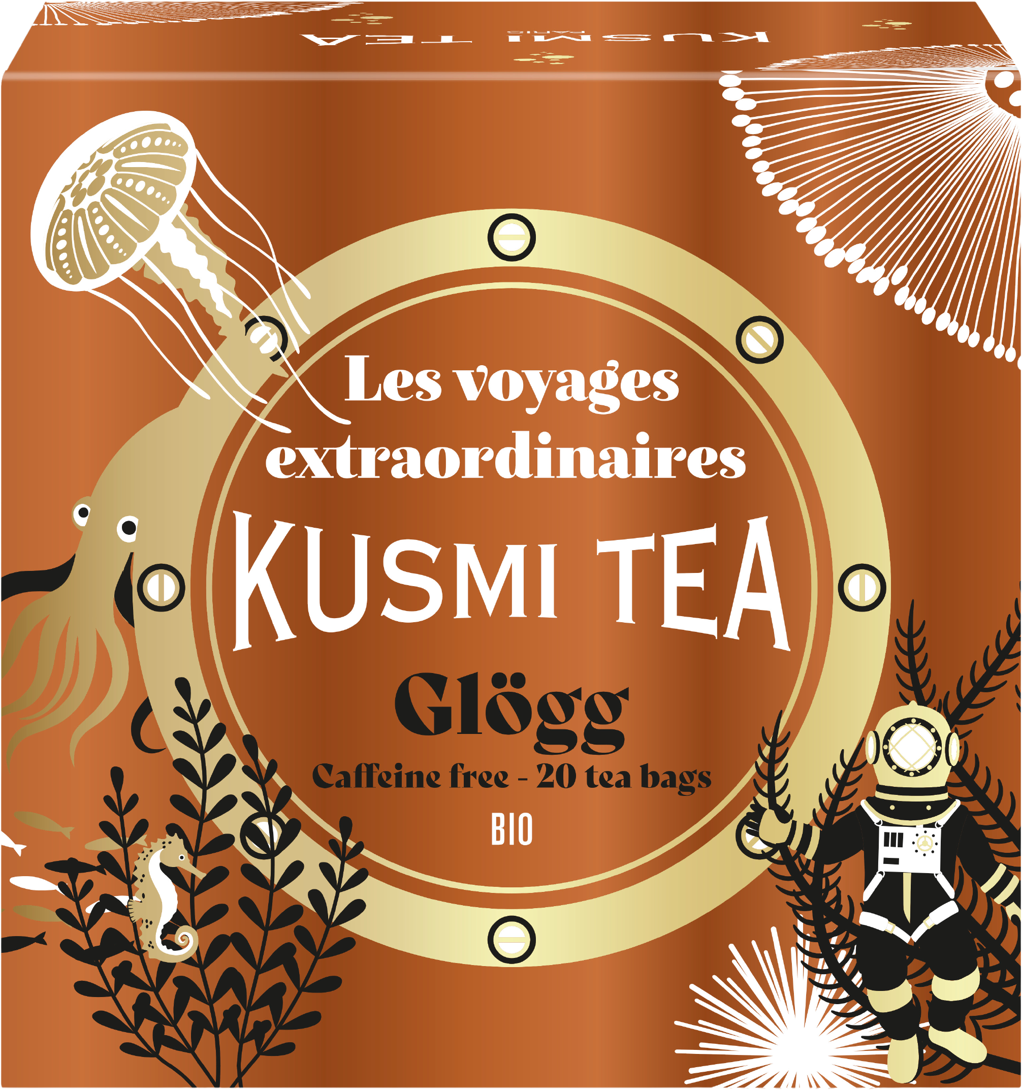 Originálna organická čajová zmes Kusmi Tea Glögg je ovocný a bylinný čaj bez kofeínu inšpirovaný tradičným škandinávskym nápojom. Je ideálny na zahriatie a dobrú náladu. V limitovanej vianočnej edícii s dizajnom zdobeným motívmi z románu Julesa Verna Dvadsaťtisíc líg pod morom Viac informácií