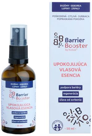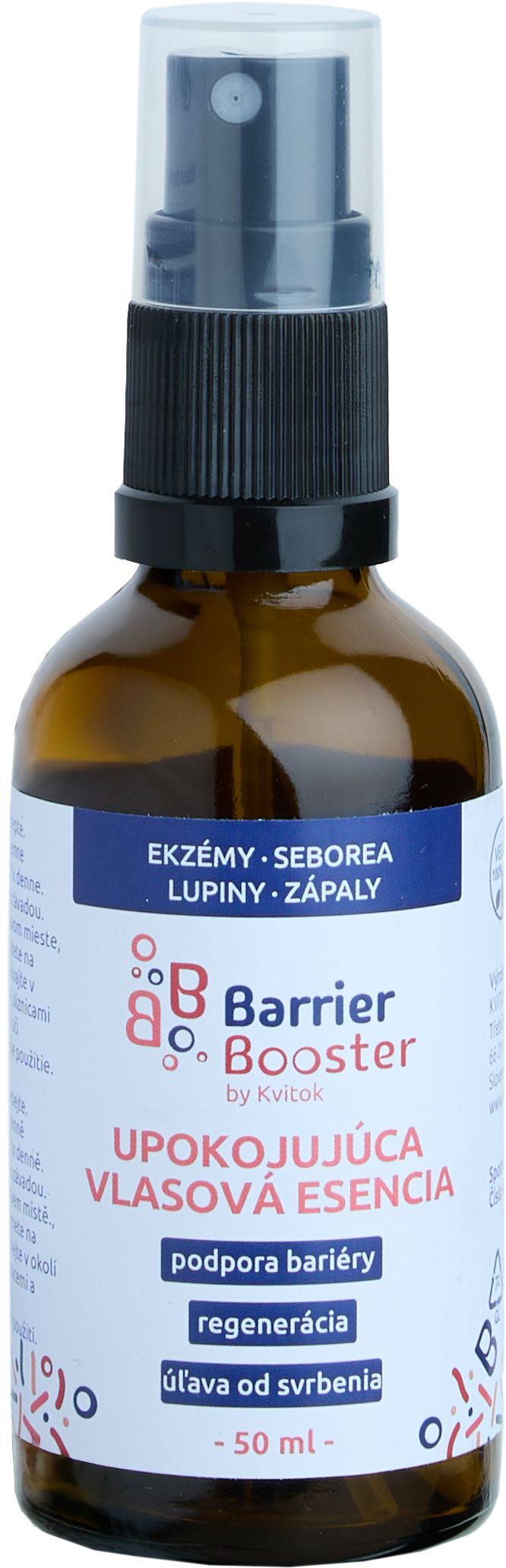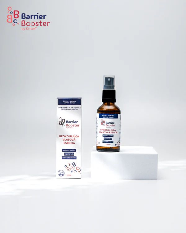 Kvitok Barrier Booster Upokojujúca vlasová esencia 50 mlVšetko o produkteDoplňujúce informácieHodnotenie produktuUpokojujúca vlasová esencia Kvitok Barrier Booster účinne ošetruje citlivú, suchú, svrbiacu alebo podráždenú pokožku hlavy so sklonom k ekzémom alebo seborei. Esencia jemne hydratuje a upokojuje pokožku hlavy bez zaťaženia vlasových korienkov. Vďaka špeciálnemu zloženiu pomáha obnoviť zdravie kožného mikrobiómu, posilňuje prirodzenú kožnú bariéru a prispieva k celkovej vitalite podráždenej pokožky hlavy. Jemné zloženie je obohatené o levanduľovú vodu a výťažky z ovsa, ktoré zvyšujú komfort a regeneráciu pokožky hlavy aj pri každodennom používaní.