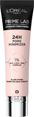 Pleť bez pórov s bázou pod make-up Prime Lab 24H Pore Minimizer obsahujúcou komplex AHA, BHA a LHA kyselín od L'Oréal Paris. Viac informácií