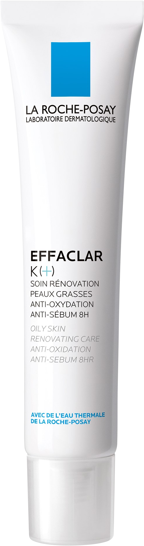 EFFACLAR K (+) poskytuje nový antioxidačný účinok a pôsobí proti sébu pomocou komplexu karnozín + vitamín E + Airlicium (táto ingrediencia zaisťuje taktiež krásny matný finiš). Naďalej pôsobí keratolyticky vďaka LHA a kyseline salicylovej a proti tvorbe kožného mazu vďaka Sebulyse.