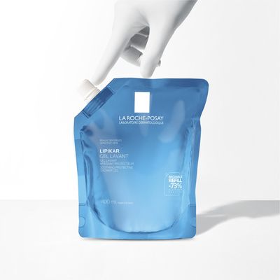 *Táto náhradná náplň obsahuje o 73 % menej plastov ako 400 ml fľaša gélu Lipikar Lavant.