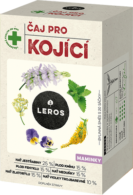 Bio čaj pre dojčiace matky Leros je vyvážená a chutná čajová zmes, ktorá vhodne dopĺňa pitný režim dojčiacich mamičiek. Bylinná zmes obsahuje oplodie šípky, vňať jastraby, plod čiernych ríbezlí a kvet levandule. Podporuje produkciu materského mlieka, má jemnú a upokojujúcu arómu a príjemnú ovocnú chuť. Viac informácií