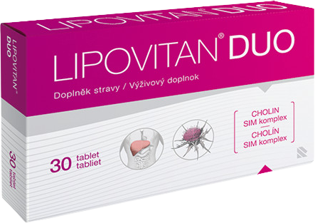 LIPOVITAN® DUO obsahuje cholín, SIM komplex (silymarín, inozitol, methionin) a vitamíny. Cholín prispieva k udržaniu normálnej činnosti pečene a prispieva k normálnemu metabolizmu lipidov. Silymarín prispieva k ochrane hlavne pred nepriaznivými účinkami niektorých škodlivín, ako sú alkohol, priemyslové jedy i niektoré chemické látky vrátane liekov. Viac informácií