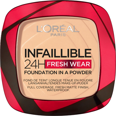 Infaillible 24H Fresh Wear Make-up v púdre od L'Oréal Paris kombinuje dlhodobé krytie a výdrž tekutého make-upu spolu s matným efektom a jednoduchou aplikáciou púdru. Ultra jemné dlhotrvajúce pigmenty zaisťujú plné krytie a dodávajú pleti spoľahlivo matný povrch bez toho, aby pleť zaťažovali či vytvárali efekt masky. Púdrová štruktúra zaisťuje pohodlné nosenie bez pocitu suchej pokožky a vďaka priedušnej formule zas prirodzený a svieži efekt, ktorý vydrží až 24 hodín. Je odolný voči vode, potu a vydrží aj pri vysokej vlhkosti.