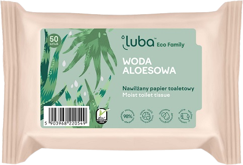 Vlhčený toaletný papier Luba Eco Family pre celú rodinu je dokonalým spôsobom, ako udržať všetko čisté a svieže po každom použití toalety. Jedinečné zloženie s osviežujúcou vodou z aloe poskytuje pocit pohodlného čistenia a starostlivosti. Fyziologické pH, dermatologicky testované. Papierový materiál 100% prírodného pôvodu, splachovateľný do WC. Používajte podľa určenia.