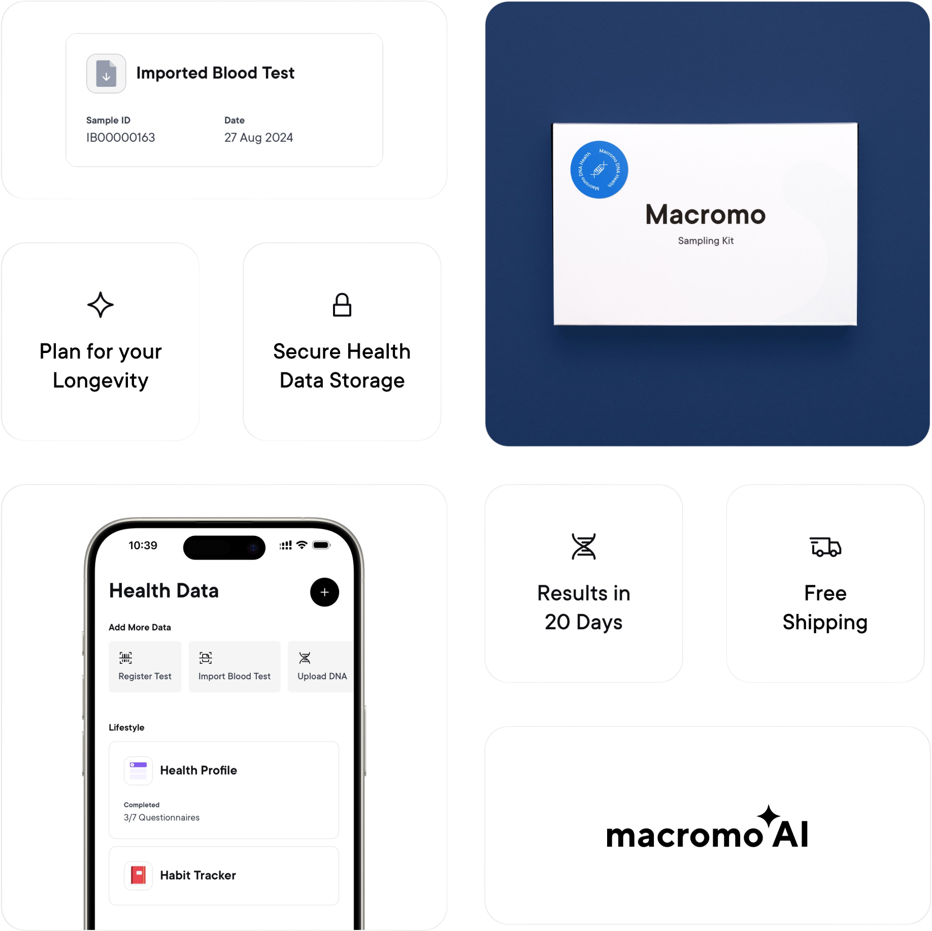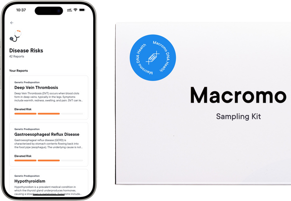 - Riziká ovplyvniteľných ochorení - časté ochorenia sú zodpovedné za väčšinu zdravotných problémov na celom svete, ale s vhodným prístupom sa im dá z 60 až 90 % predchádzať. Macromo vám pomôže odhaliť vaše rizikové faktory životného štýlu a genetiky pre tieto ochorenia, aby ste mohli podniknúť akčné kroky k ich prevencii a predĺžiť si tak váš aktívny život.