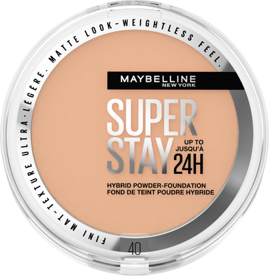 Maybelline New York SuperStay 24H Hybrid Powder-Foundation 40 make-up v púdri, 9 gVšetko o produkteDoplňujúce informácieHodnotenie produktuDokáže to aj tvoj púder? Kombinácia krycej vlastnosti make-upu a zmatňujúceho účinku púdru so SuperStay 24H Hybrid Powder-Foundation od Maybelline New York bez pocitu zaťaženia. Nezalieza do vrások, pohlcuje nadmernú mastnotu a vydrží až 24 hodín bez rozmazania.