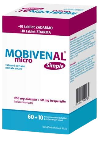 Mobivenal micro a micro Simple sú výživové doplnky, obsahujúce flavonoidy: diosmín (450mg) a hesperidín (50mg) vo forme mikronizovanej purifikovanej flavonoidnej frakcie (MPFF). Mobivenal micro je zároveň obohatený o aescín z pagaštanu konského, ktorý prispieva k normálnej činnosti cievnej sústavy (ťažké nohy).